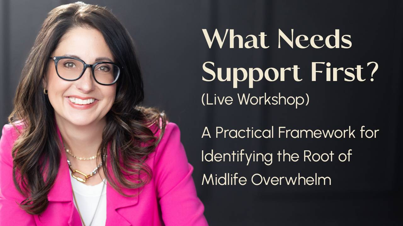 What Needs Support First? is a 90-minute live workshop for high-achieving women in midlife that helps you understand what your body is signaling, identify whether physical, emotional, or systemic support is needed first, and stop guessing where to begin.
